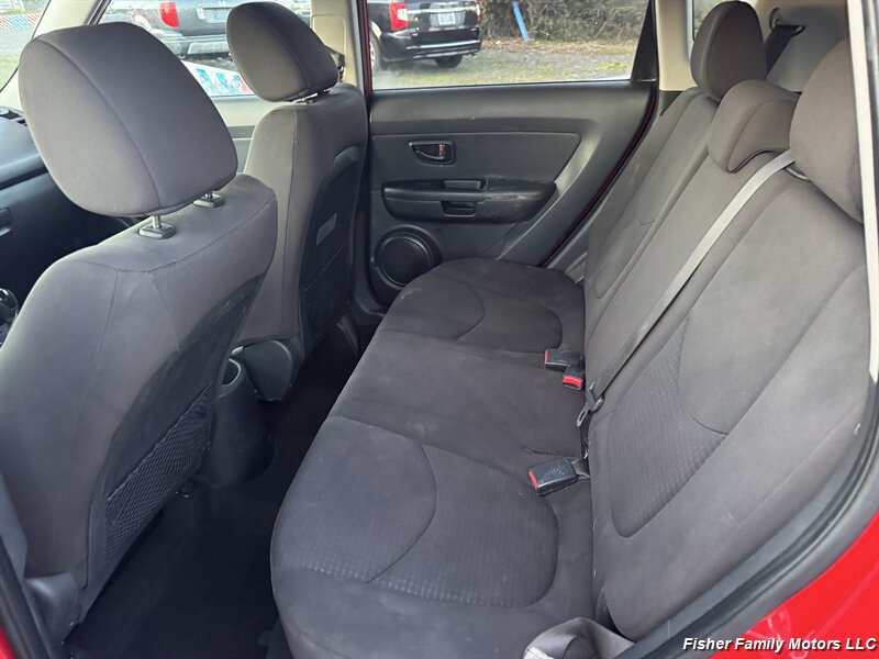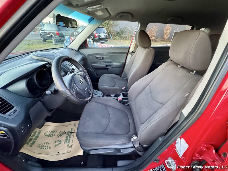 2013 Kia Soul in Molten with a Black cloth interior, powered by a 1.6L I4 (138 hp, 123 lb-ft). It has below 134,000 miles (averaging under 10,000 miles per year) and is in excellent overall condition, achieving about 25 MPG city and 30 MPG highway. Factory equipment includes standard safety features (ABS, electronic stability and traction control, front-seat side airbags and full-length curtain airbags, tire pressure monitoring), plus comfort and convenience items such as air conditioning, black cloth seating, power windows and locks, remote keyless entry, a 60/40 split-folding rear seat, steering-wheel audio controls and an AM/FM/CD/MP3 audio system with auxiliary and USB inputs.
